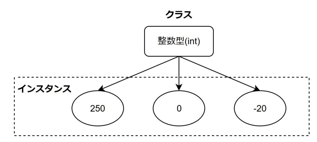 例えば、整数型(int)は一種のクラスであり、その整数型という設計図をもとに作られた数字がインスタンスです。
